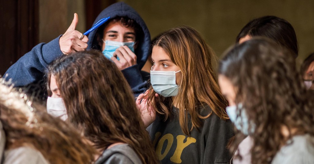 El salón de actos de la escuela acogió a más de 140 jóvenes con mascarilla, como también los ponentes en el estrado, y con muchas ganas de escuchar, opinar y preguntar.