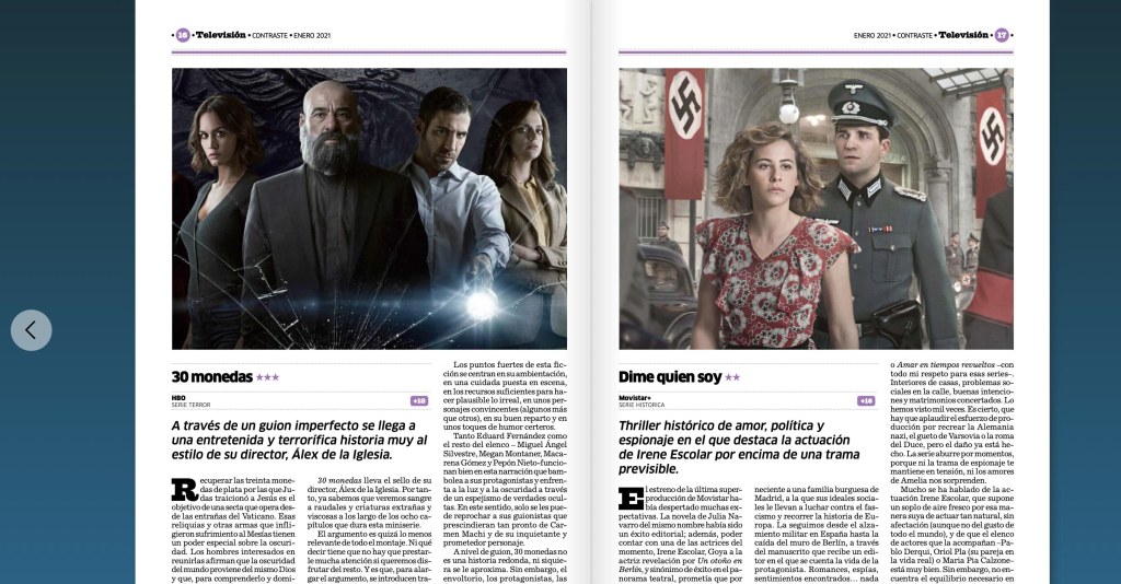 Es por eso que algunas de las críticas que se encuentran en la revista de enero se centran en producciones destinadas a un público infantil – Agencia de asuntos mágicos o Casa Búho–, y otras a un público más bien juvenil y no tan adulto; por ejemplo, Spinning out o Gambito de dama. Contraste no se olvida de las series que son tendencia, aunque no estén destinadas a un público tan joven; de ahí que también podamos leer los comentarios de Roadkill o 30 monedas.