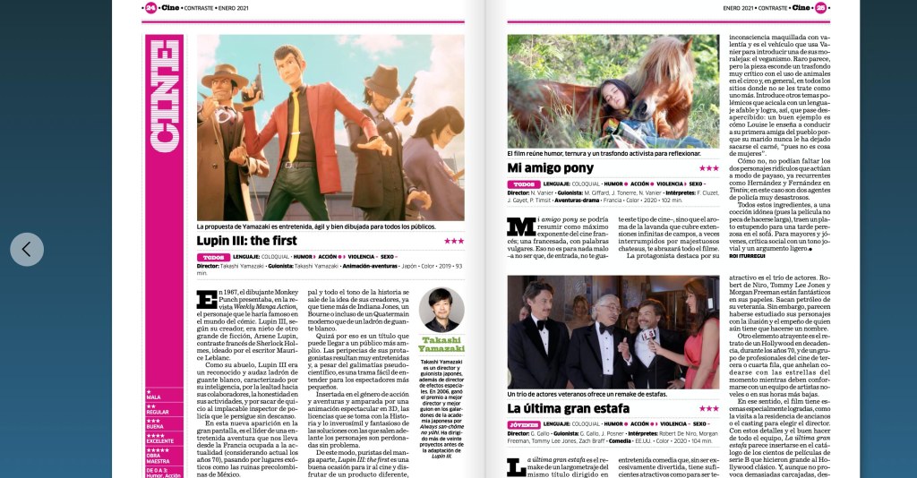 Lo mismo sucede con las críticas cinematográficas; la revista abarca análisis de las películas que se estrenan el mismo mes. El objetivo sigue siendo presentar al espectador una guía sobre los contenidos a los que tiene acceso para que pueda elegir en qué invertir su tiempo de manera óptima y consciente. Lupin III: the first, El padre, Soul, Wonder Woman o La última gran estafa son algunos de los títulos que se hacen hueco en la revista de este mes.