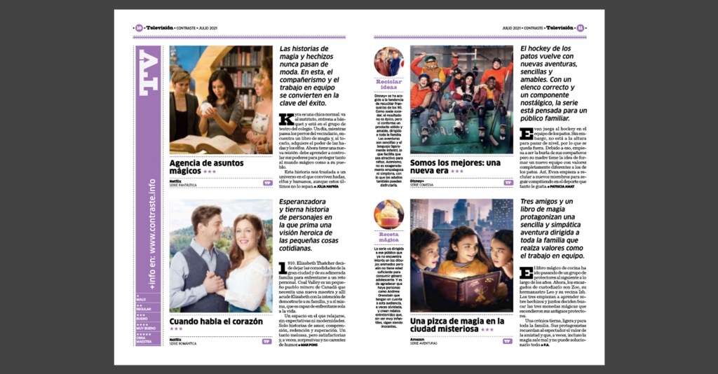Por ello, aprovechando dicho aumento de tiempo dedicado a la vida digital, la revista Contraste se convierte en la guía perfecta para saber qué ver o jugar y acertar con la selección. En su número más reciente, publicado el pasado mes de julio, pueden leerse los análisis y las críticas de una selección de películas, series y juegos ideales para estas vacaciones.