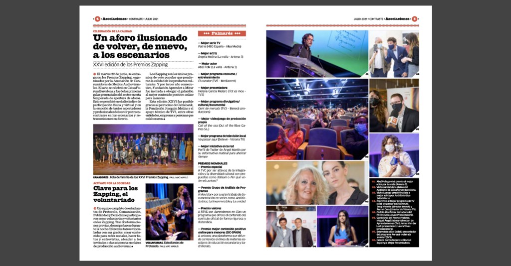 La revista de Contraste también cuenta con un apartado destinado a las acciones que realizan Fundación Aprender a Mirar y Asociación de Consumidores de Medios Audiovisuales. Por ello, en la edición de julio se puede encontrar un artículo sobre la celebración de la XXVI edición de los Premios Zapping.